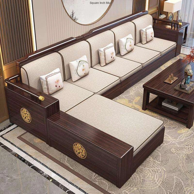 Elegant Solid Wood Sofa Set for Living Room - Zen-Inspired 3-Seater Combination in New Chinese Style, Luxurious Classical Design with Chaise Lounge, Perfect for Home Décor.
