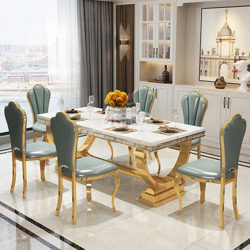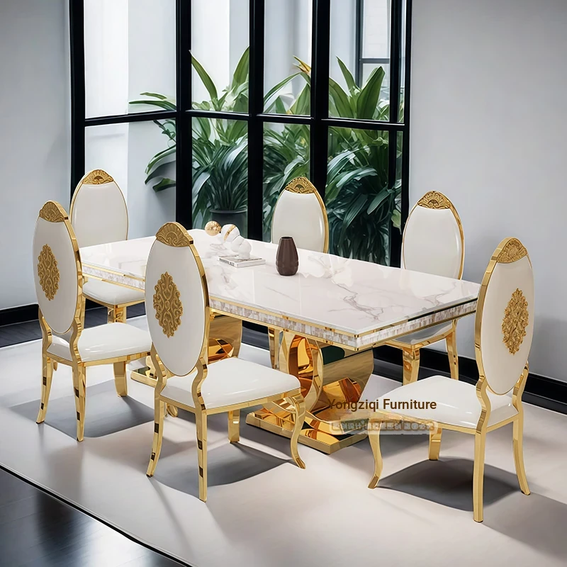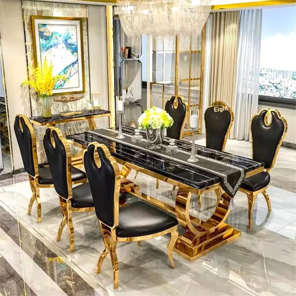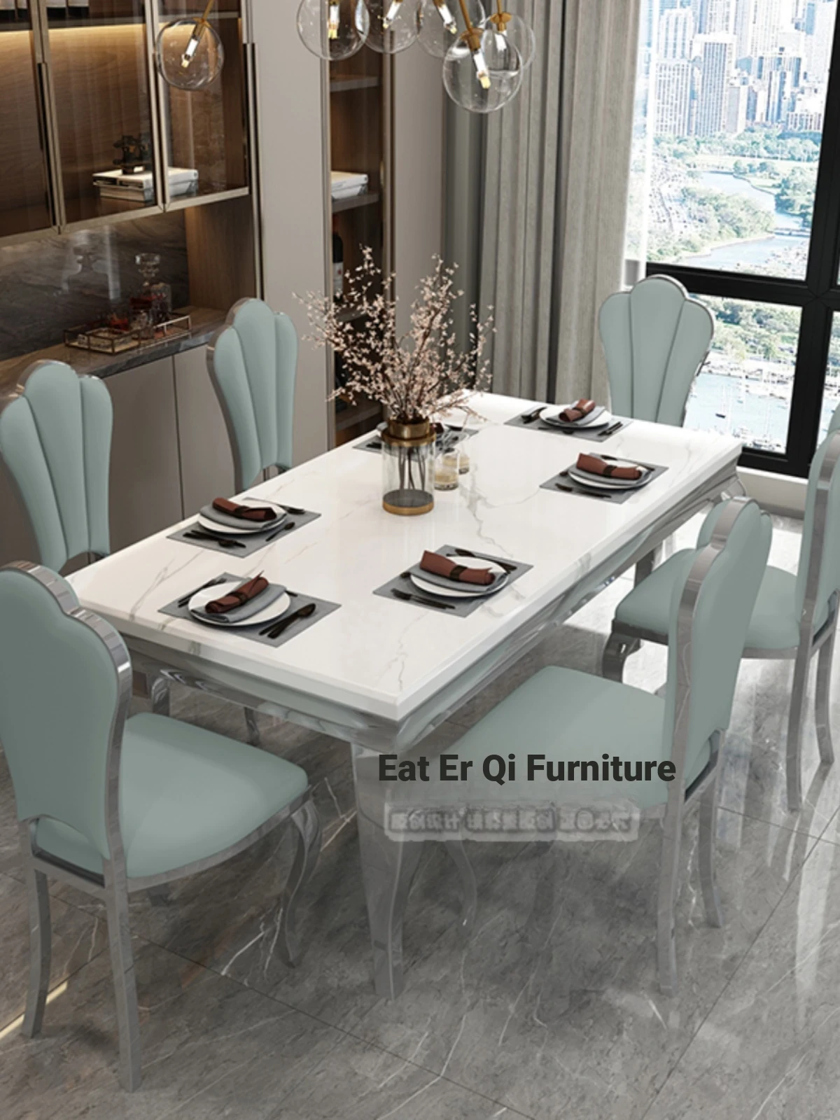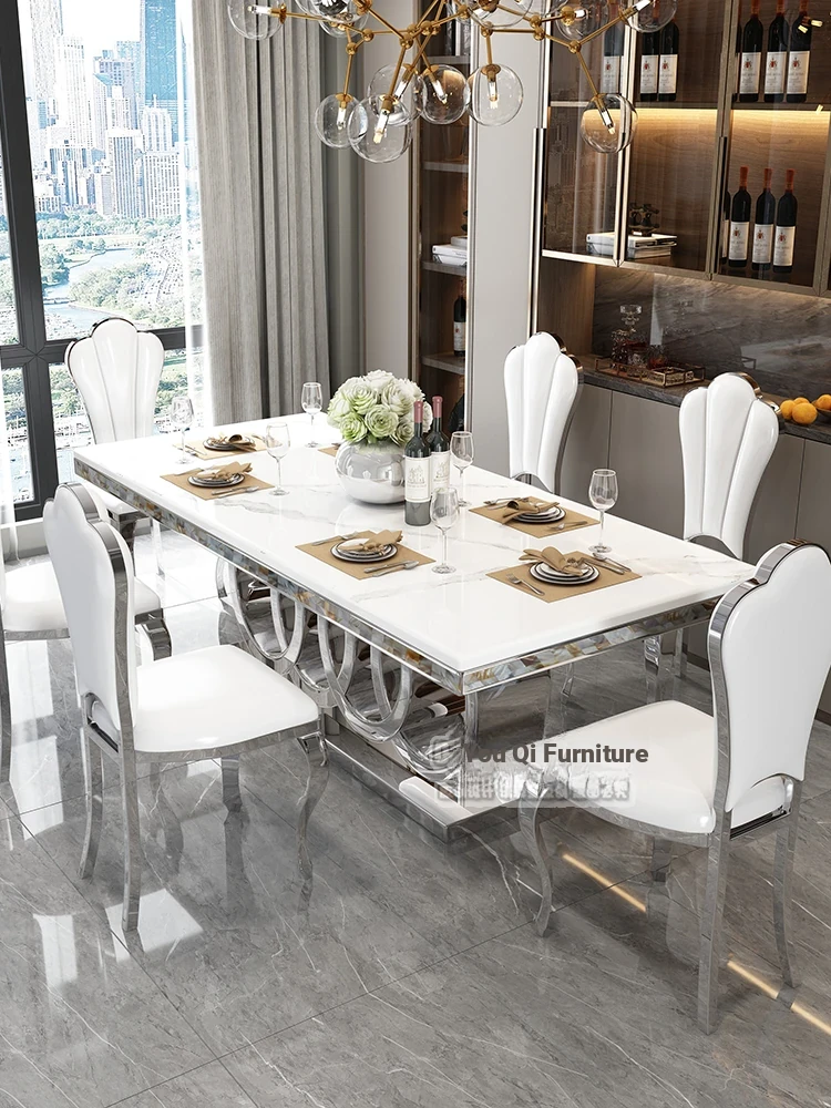 Modern Minimalist Luxury Dining Table Set - High-End Stainless Steel with Italian Marble Rectangular Table and Chairs, Glossy Stone Finish for an Elegant Dining Experience.