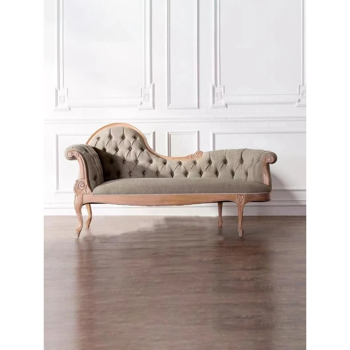 American Country Style Solid Wood Chaise Lounge - Elegant Fabric Daybed for Living Room, European Light Luxury with Exquisite Carvings, Perfect Single Recliner for Bedroom