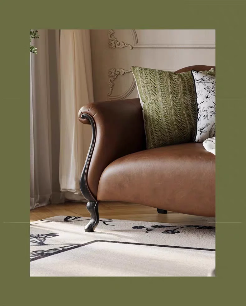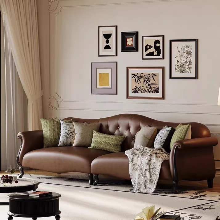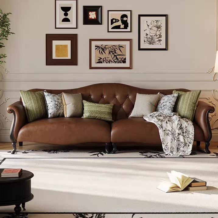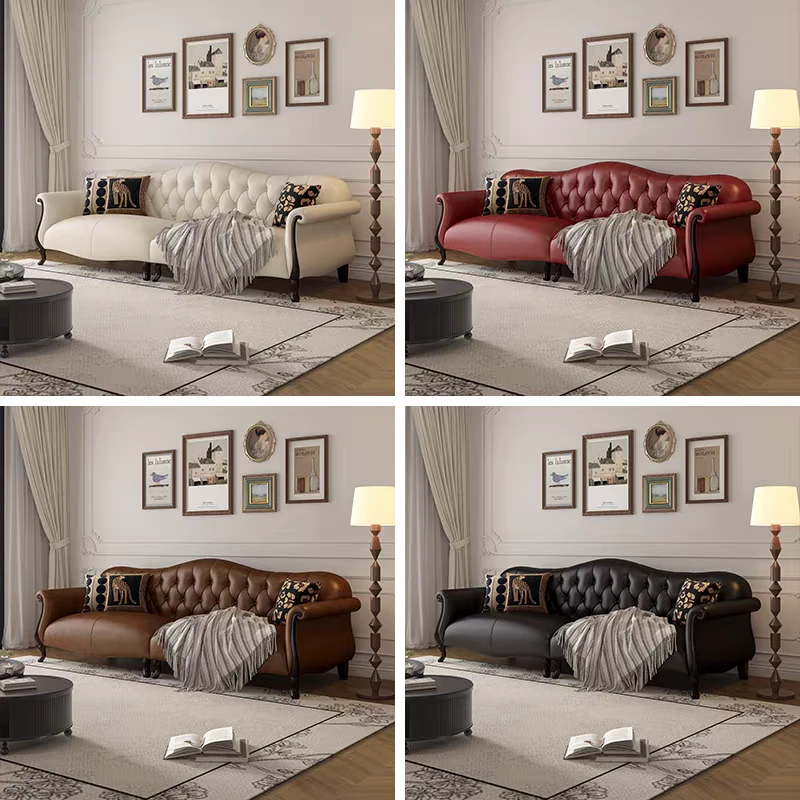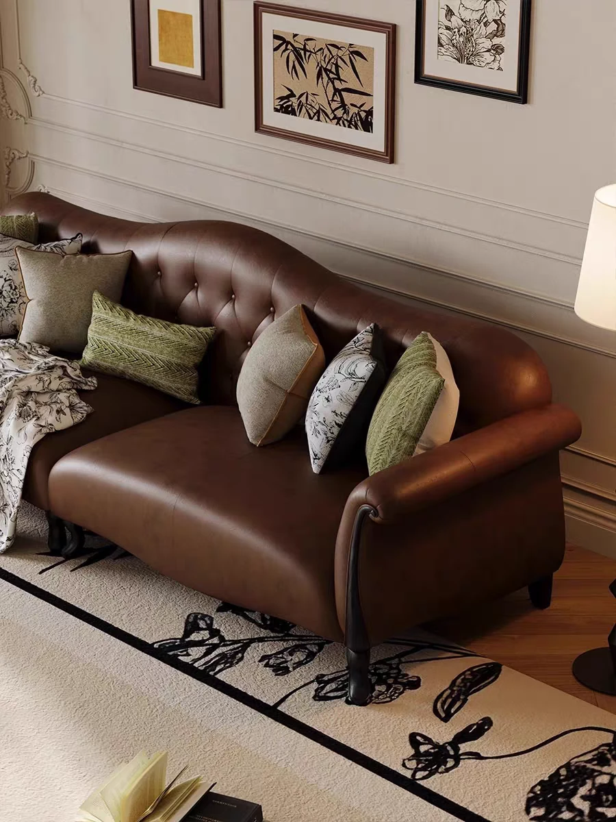 American-Style Solid Wood Genuine Leather Sofa – Vintage Cream Aesthetic, Perfect for Small Spaces, High-End Living Room, Trendy Straight Sofa, Retro Design