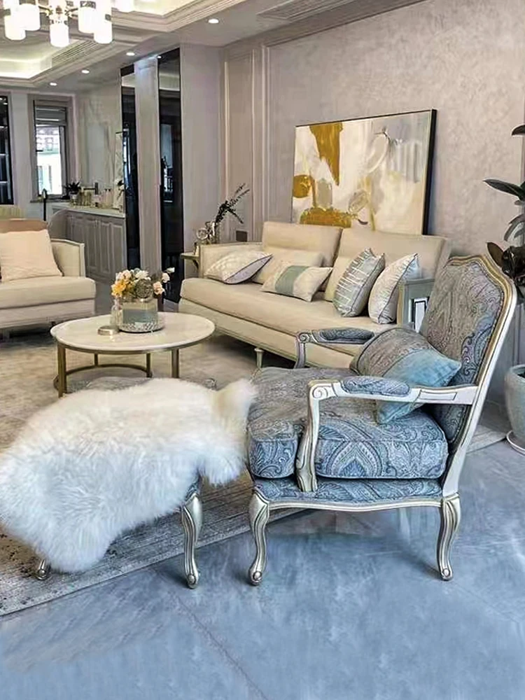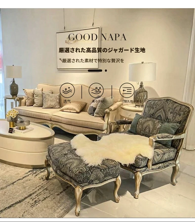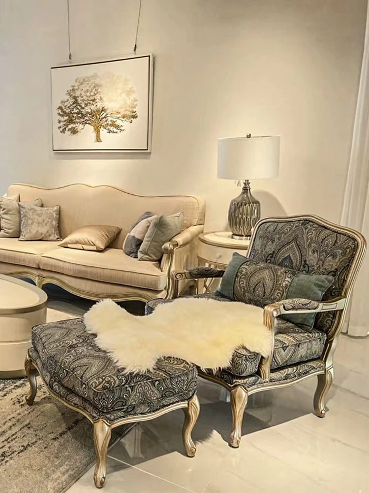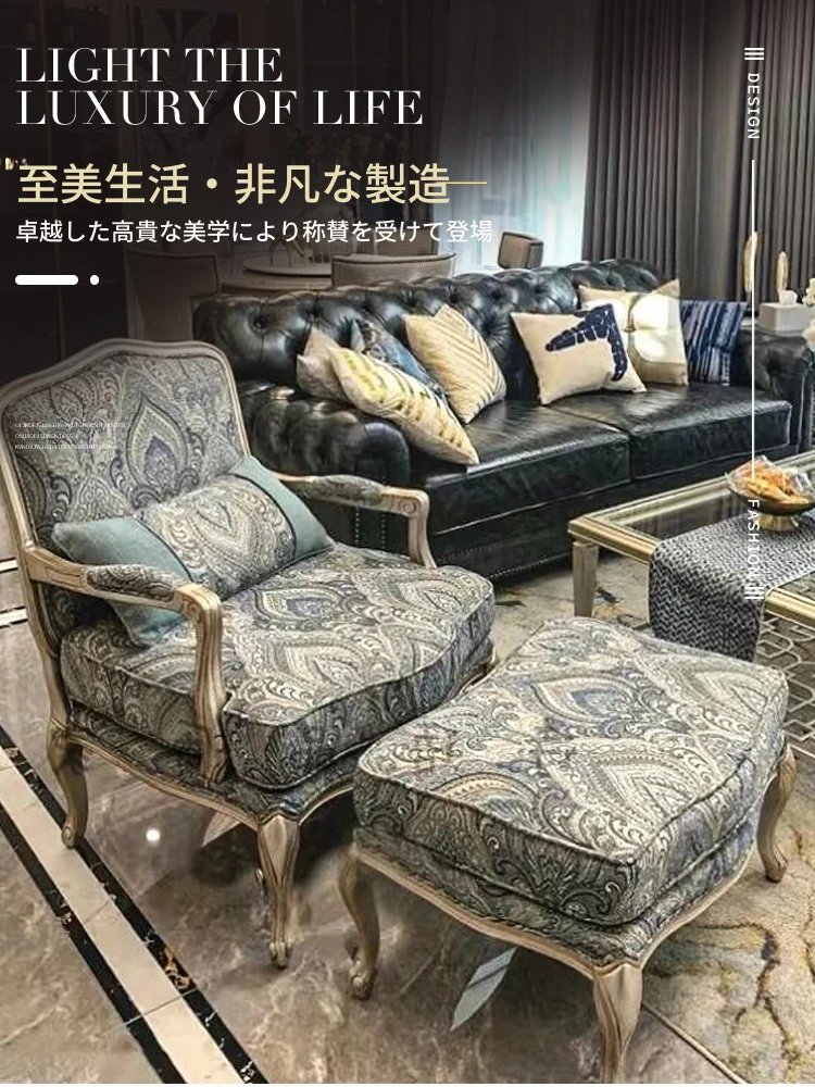 アメリカンスタイルの無垢材とファブリック製シングルソファー|ラグジュアリーなフレンチデザインの虎椅子|欧風リビングにぴったりなリラックスチェア!快適さとスタイルを両立した一品。