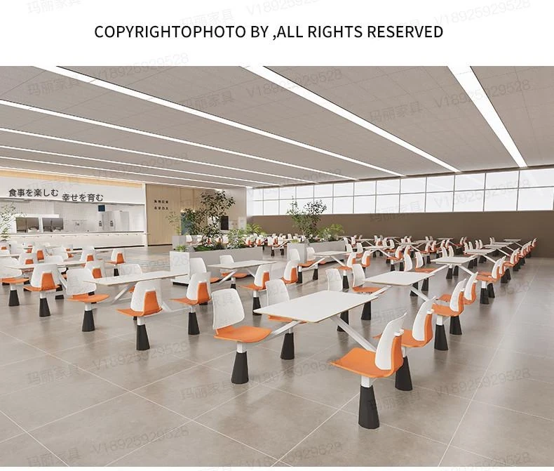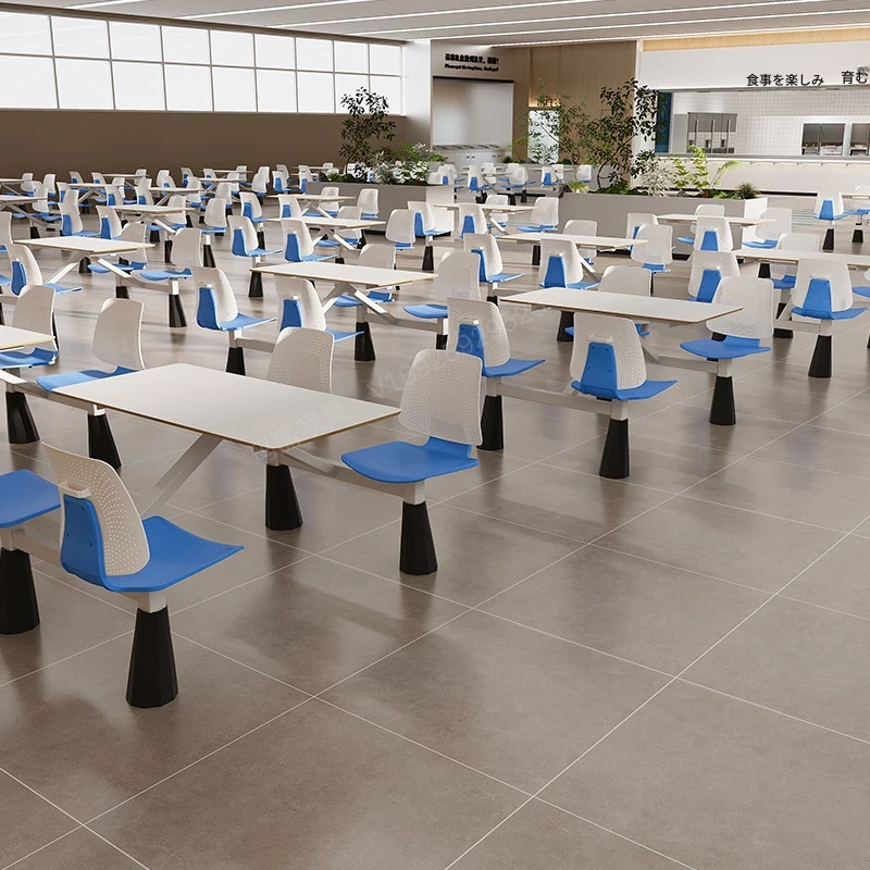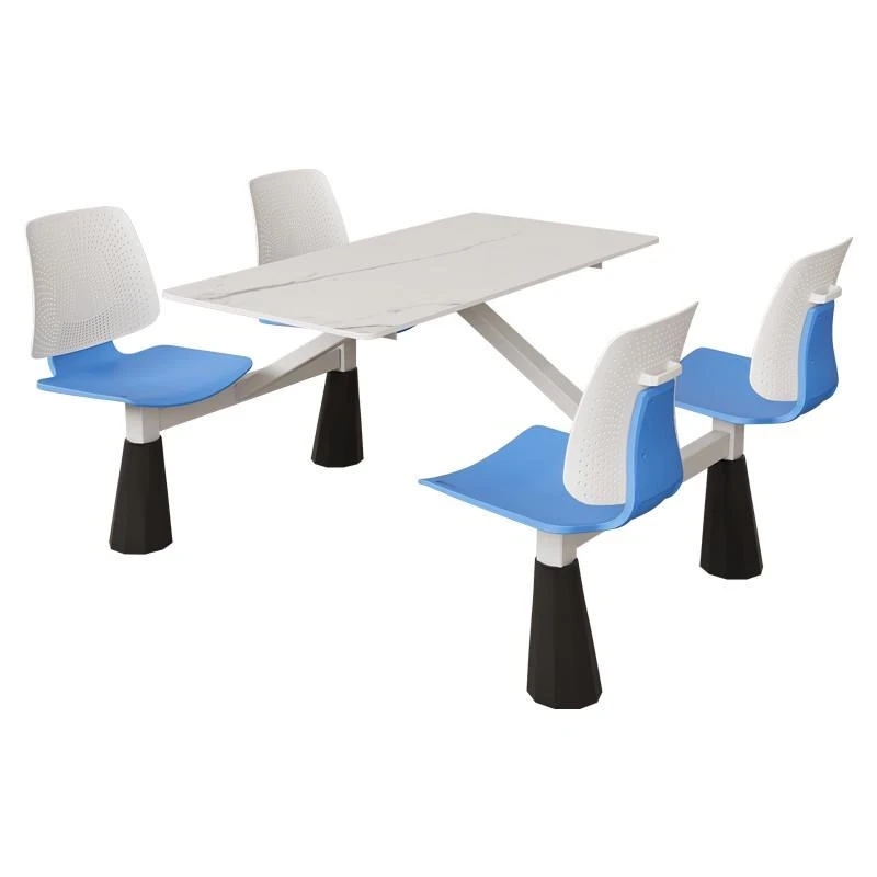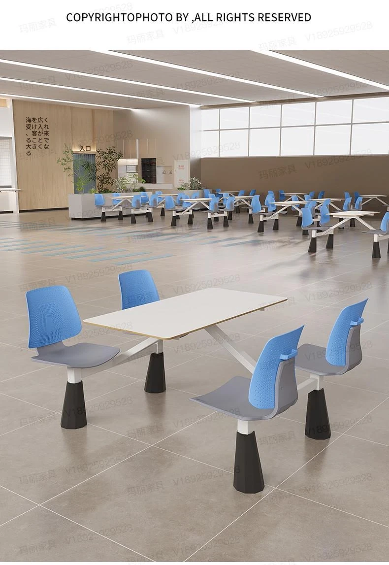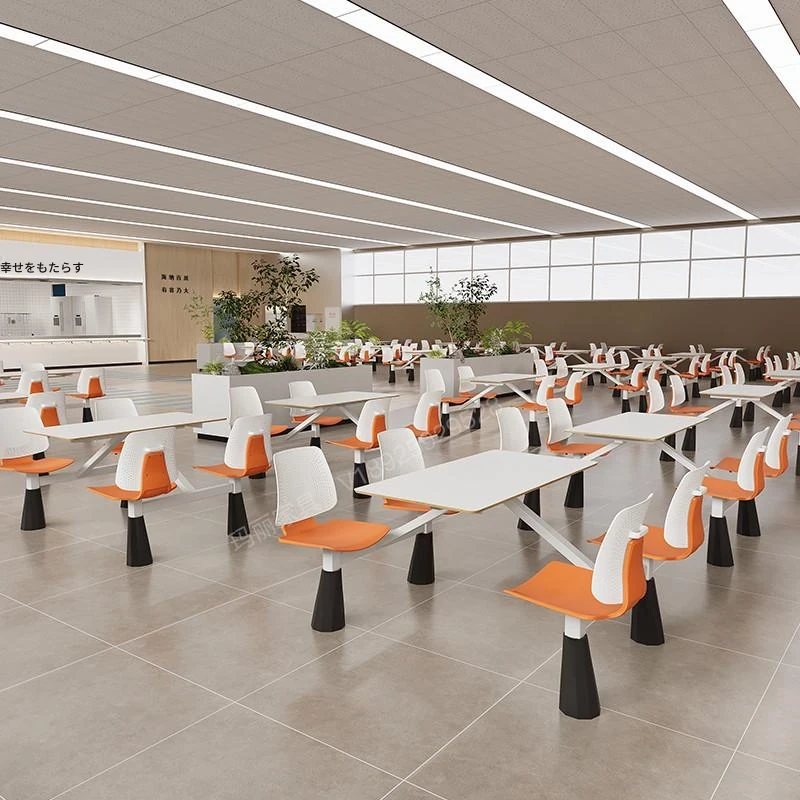 学校食堂や従業員食堂に最適!快適な4人用一体型ファーストフードテーブル&チェアセット - 高速サービスエリアやレストランでも大活躍!クイックサービスを実現するスタイリッシュなデザイン。