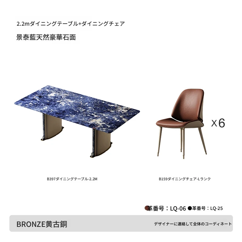 2.2m ダイニングテーブル [景泰蓝の贅沢な石面]+B159ダイニングチェア[L級 全青皮]*6