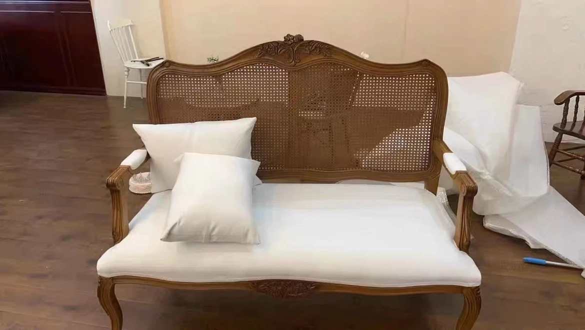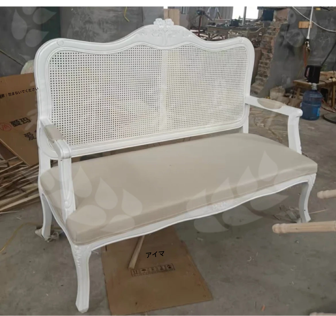 アメリカンカントリー風の無垢材彫刻入りフレンチスタイル、ゴールドエイジング仕上げのダブル&トリプルソファ。フォトスタジオや民宿にぴったりな、洗練されたデザインで居心地の良い空間を演出します!
